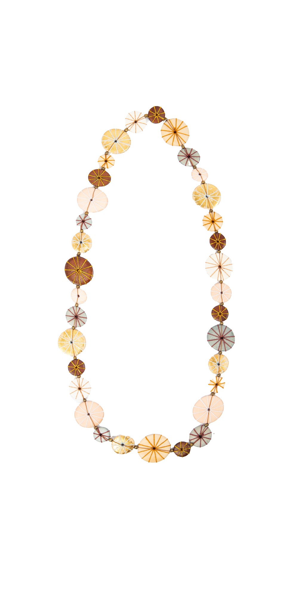 Featuring layered wooden discs wrapped in contrasting thread, this necklace creates depth and visual interest, making it the perfect piece to elevate simple outfits. The vibrant mix of colours adds a playful yet sophisticated touch, while the lightweight construction ensures comfortable all-day wear. Designed to sit effortlessly, it can be easily styled over linen tops, dresses, or relaxed silhouettes for a modern, bohemian-inspired look.