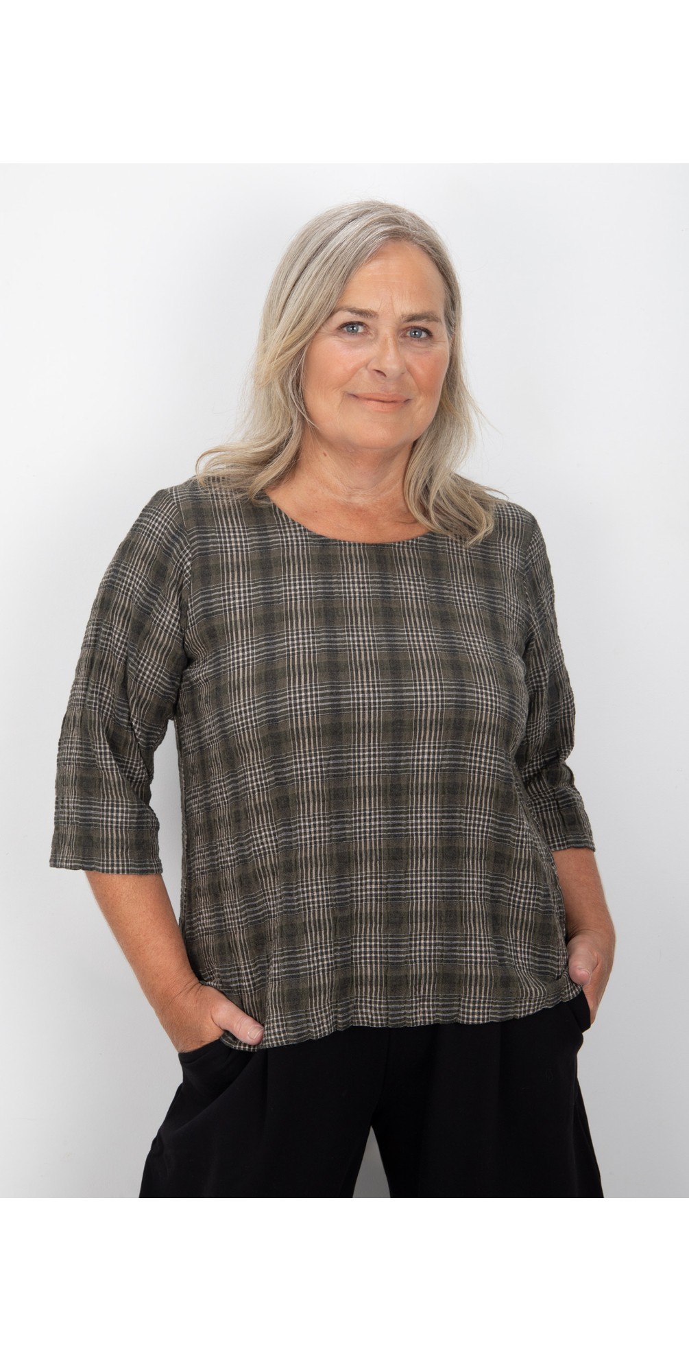 New to the collection is the Danica Structured Check Top from Thing. Featuring a mid-length sleeve, a round neck, and a lightweight material with a flowy silhouette, perfect for transitional styling. Style with the matching trousers for a complete look and accessorize with boots and jewelry.