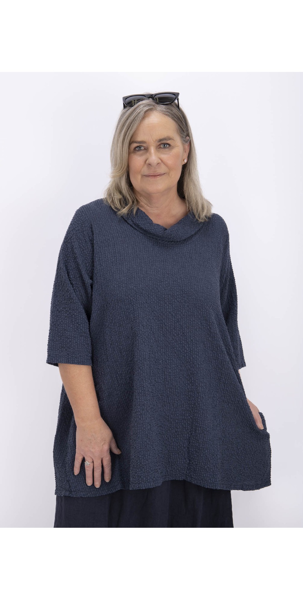 Thing Tora Navy Linen Seersucker Cowl Neck Top