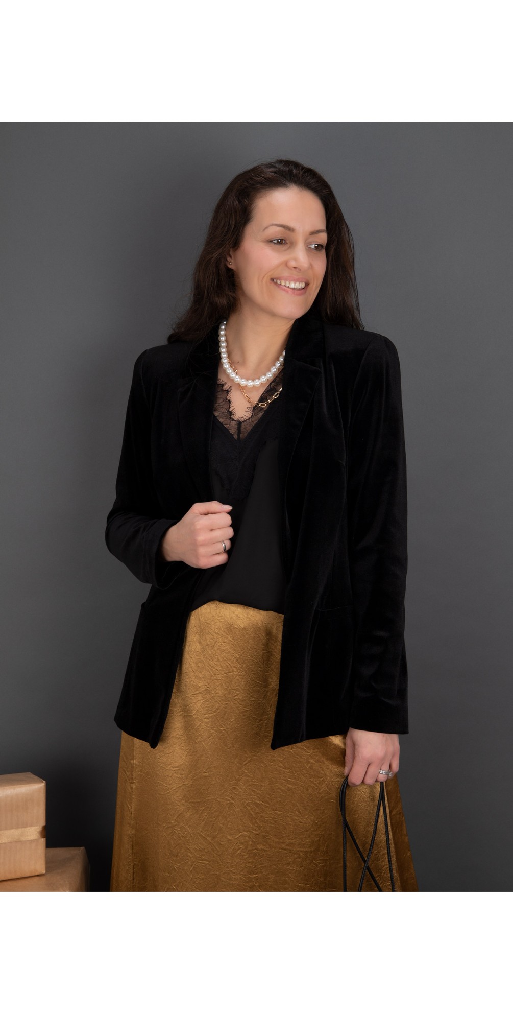 This classic blazer is a chic party accessory. Pair over dresses, or dress up simple jeans and tops - or embrace the velvet trend by pairing it with matching trousers from Tia! The Velvet Stretch Black Blazer Jacket features small shoulder pads, an open front and an amazing stretch velvet and lining to ensure a perfect fit.