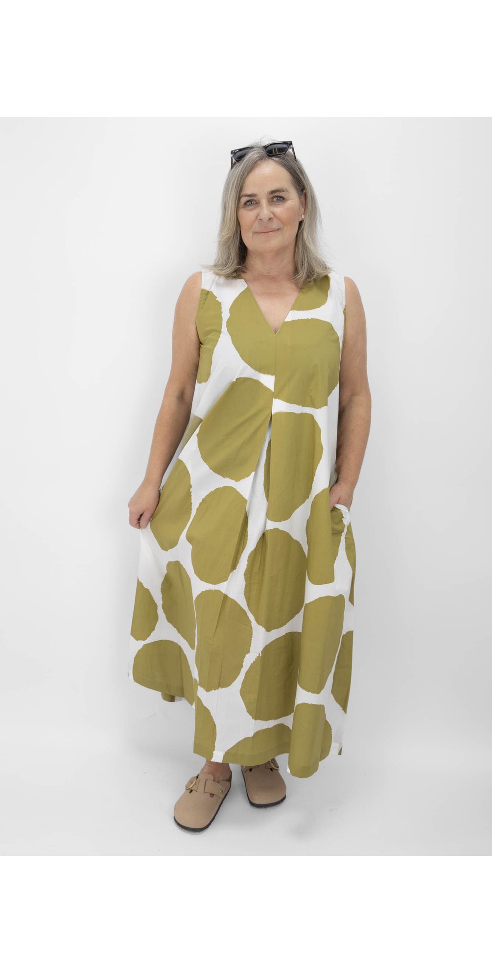 Crafted from 100% cotton poplin, the fabric feels lightweight and fresh against the skin while offering beautiful shape and movement. The flattering V-neckline enhances its feminine appeal, while the front inverted pleat creates graceful flow and subtle volume through the silhouette. Falling to a maxi length, this printed dress simply pulls on for easy, fuss-free wear — perfect for holidays, garden parties, or relaxed daytime dressing.