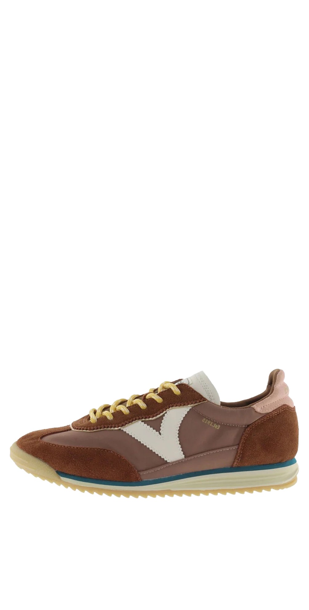 The Saturno Nylon & Suede Trainer is a retro-inspired sneaker from Victoria Shoes, combining sporty aesthetics with contemporary colour-block styling. Crafted from lightweight nylon with layered suede panels in tonal hues, these trainers feature the brand’s signature V logo in contrasting leather-effect detail on the side, alongside a coordinating heel tab for added visual interest. Finished with round lace fastenings and a distinctive two-tone sole with a caramel serrated EVA tread, they deliver both comfort and everyday versatility. Style with anything from relaxed denim to dresses or casual tailoring for an effortlessly cool, off-duty look.